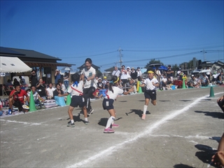 プログラムの最後は、年長児のクラス対抗リレー、特別ゲストで担任の先生と2人の先生が助っ人で大活躍しました。思わず力が入いた応援になりました。お疲れさまでした。