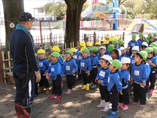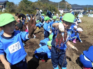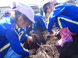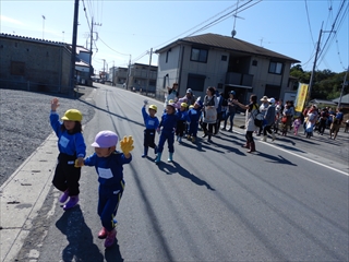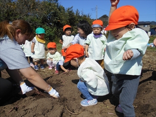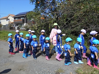 0歳児~5歳児全員と親子教室の方で芋畑に歩いて、交通安全の勉強も兼ねていきました。