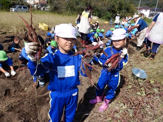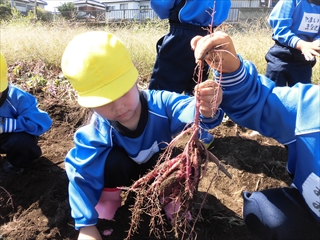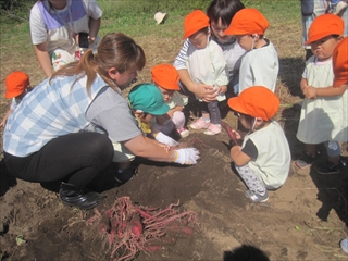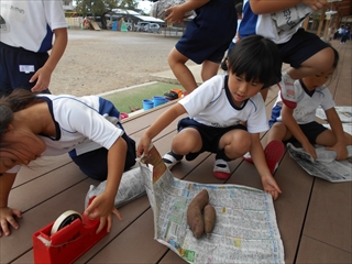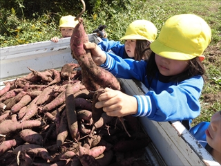 お芋を沢山掘って、幼稚園でお芋を新聞紙に自分達で包んでお土産にしました。その他に蒸かし芋用、芋ご飯用、焼き芋用に取り分けて保管しました。